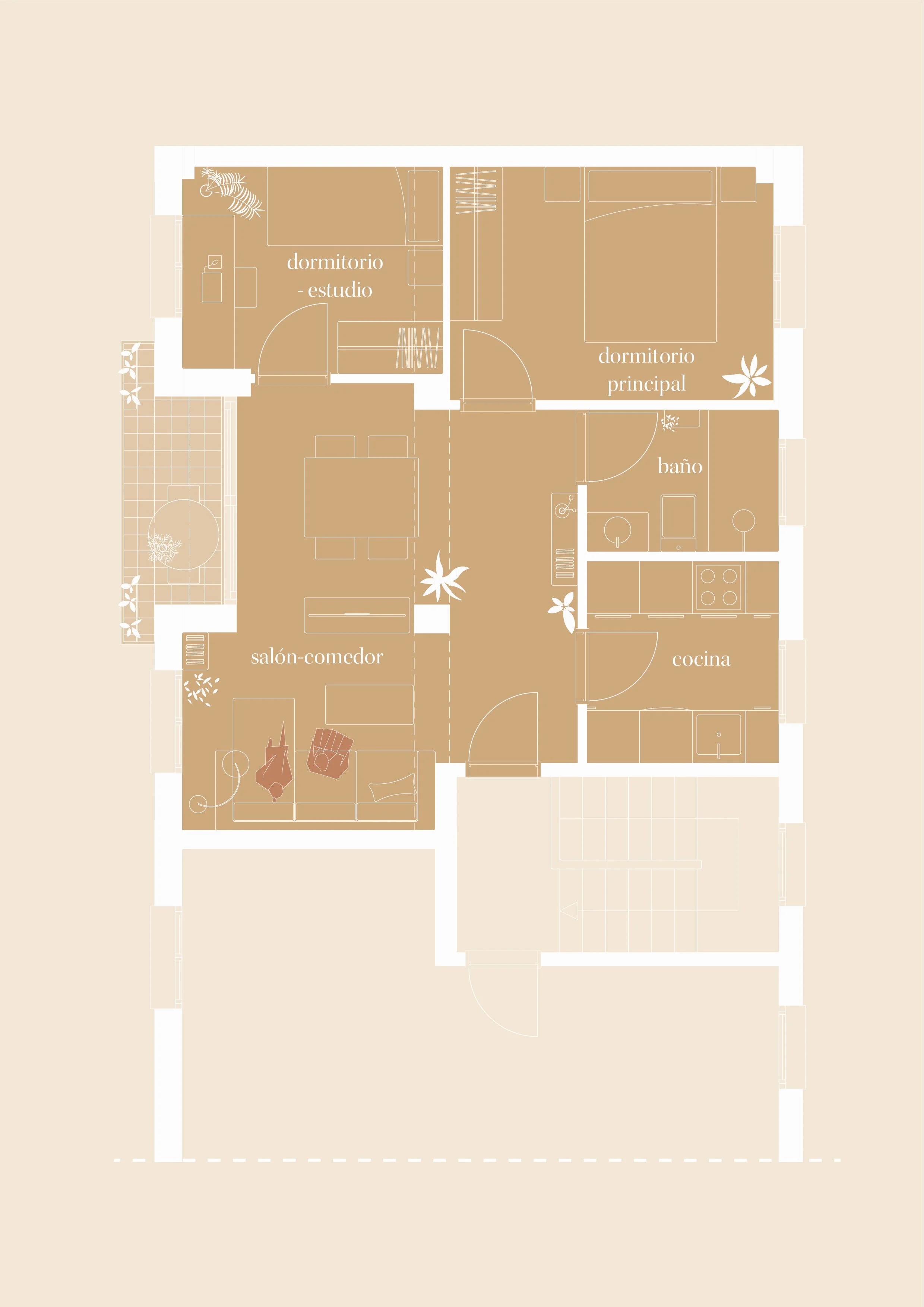 Hugo y Macarena son una pareja joven que, después de años viviendo a distancia, deciden establecerse en Sevilla en esta pequeña vivienda situada en la barriada Elcano, una zona nacida a mediados del siglo XX y habitada originalmente por los astilleros de la ciudad.