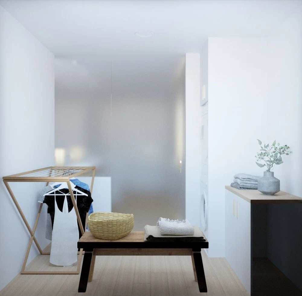 La compartimentación del espacio se realiza dejando por un lado la zona de lavado junto a la ventana y, separado por un elemento translúcido que deja pasar la luz y permite con su apertura para ventilar, encontramos un amplio baño elegante y atemporal y con mucha capacidad de almacenamiento.
